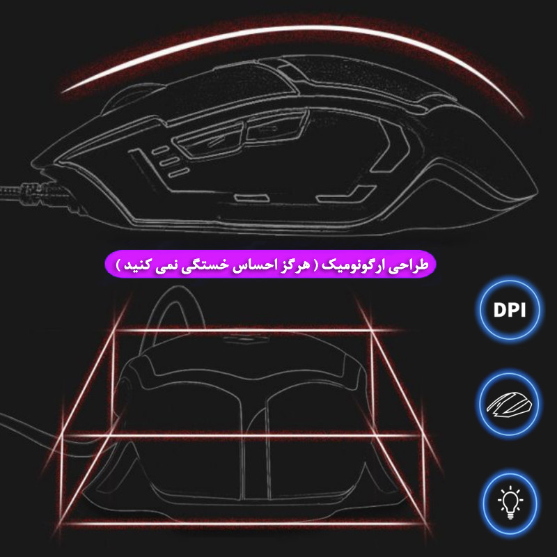 | سایر قابلیتهای ماوس | دارای 6 کلید/ دارای بدنه از جنس abs / طراحی ارگونومیک منطبق با گودی دست کاربر جهت عدم خستگی در استفاده طولانی مدت / دارای طیف های نوری جذاب متحرک (RGB) دارای کلید های بک و فوروارد / دقت فوق حرفه ای تا 3200 و قابل تنظیم به واسطه یک کلید بر اساس نیاز کاربر |