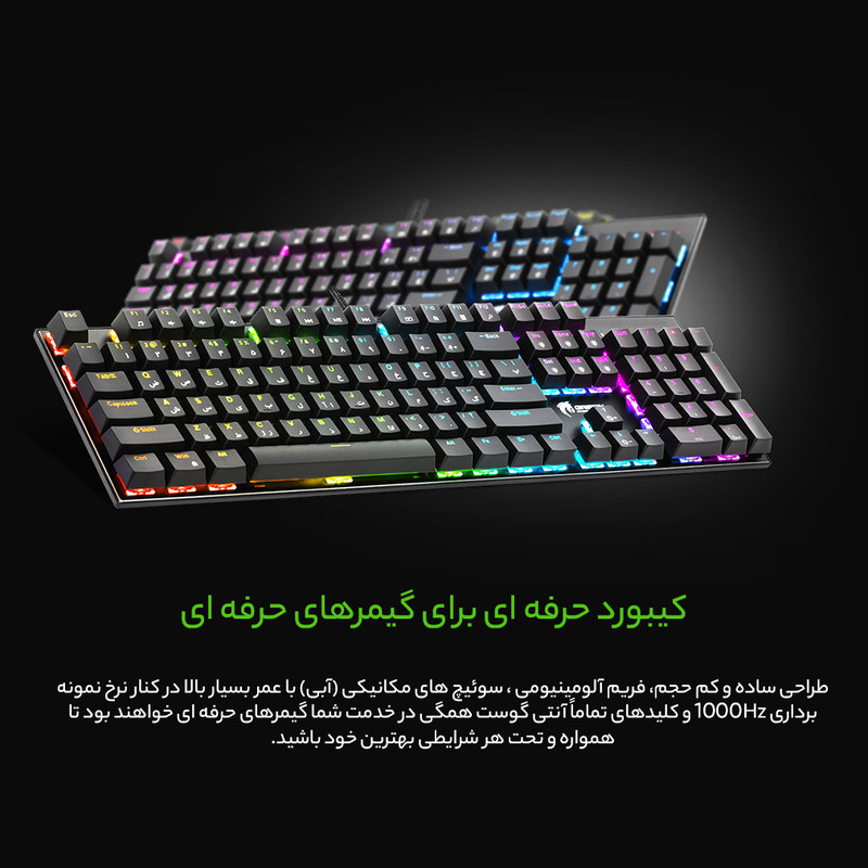 | سایر قابلیتهای صفحه کلید | نرخ نمونهبرداری (Polling Rate) 1000هرتز / مجهز به کابل USB Type-A به USB Type-C جدا شونده / قابلیت تنظیم جلوههای نورپردازی RGB |